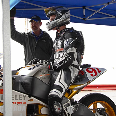 Out on the track, there is no whispering. The thunder of the air-cooled twins is only slightly damped by the rain and the stands, while thinly populated, are rapt with attention. The rain is cold and your breath plumes like exhaust. Then it happens at the far end of Shannonville’s long back straight; Brett McCormick’s Number 91 Buell XB9R, loses the front end and his race ends.