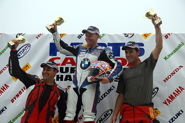 Even three weeks later, in Shannonville, witnesses are using uncomfortable words like “altitude”, “loft”, “trajectory” and “impact” to describe Chris Duff’s round 6 “get off” at Shubenacadie, NS. Duff went down and broke his foot in some four places in a high-side that saw his BMW R1200S tear itself to pieces in a series of impacts. Today Duff’s teammates, Michael Taylor and Oliver Jervis, stay upright in the wet, taking the day with first and second. One hopes such wins are enough to counteract the still talked about spills in the public’s eye.