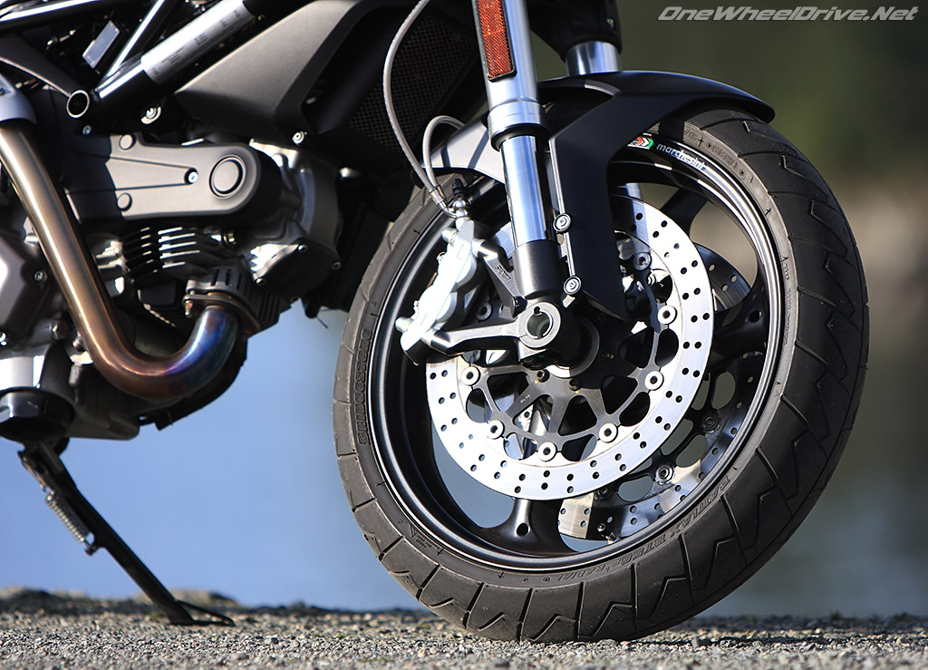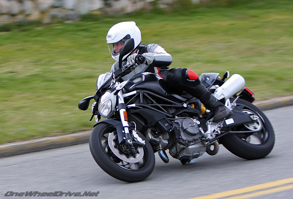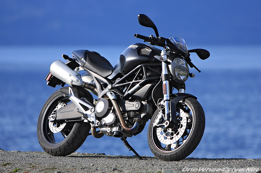 9000RPM slips you past the power, while three LEDs over the digital gauge flash briefly signaling the impending rev limiter a 1000RPM later. Executing a tidy clutchless up-shifts, the Monster kisses the far side of fast uphill before I roll off the throttle.