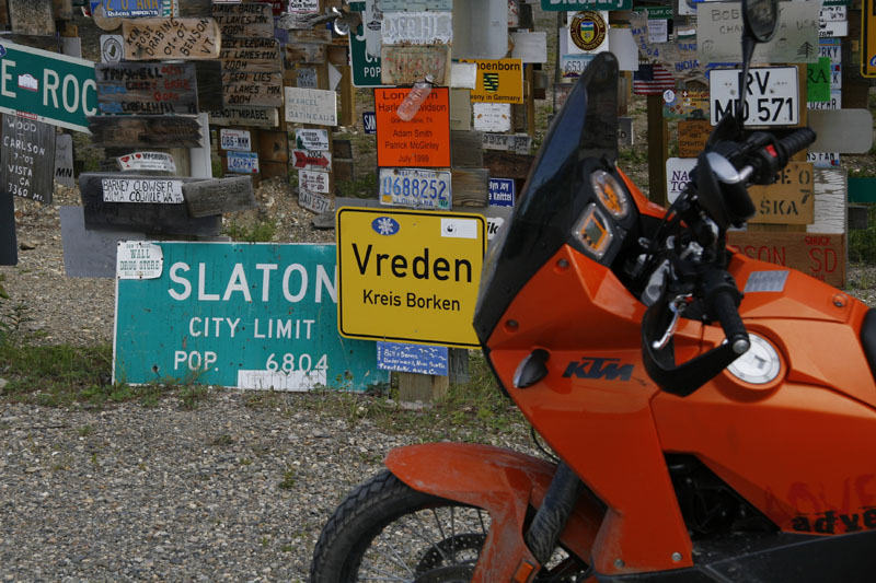 I should have just camped. The Belvedere Hotel has one of the few licensed lounges in Watson Lake, making it the hot spot. Having a room overlooking the parking lot was good for the bike’s security, but bad for sleep as staggers of drunks exited and then loudly discussed what or who to do next in the parking lot.Midnight, 1:00, 2:30, and 3:00, the successive waves clashed against sleep. Welcome to the Yukon. How odd though to look out the window, shout at someone for sitting on one of the Goldwings parked below, and see a penumbral mix of dusk and dawn. Eventually I fall into a fitful sleep.