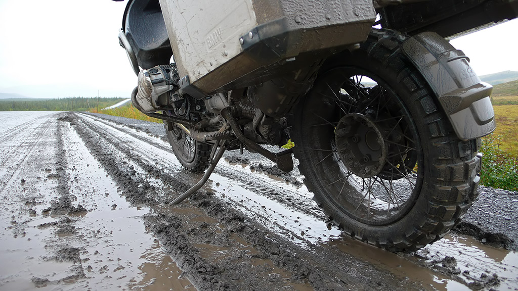 At least the “easy stretch” is ahead, but the Mud-Beast isn’t out of tricks. Fourty kilometers south of Inuvik a shale-sharp fang slashes the rear tire sidewall on the big Beemer with predatory thoughtlessness.