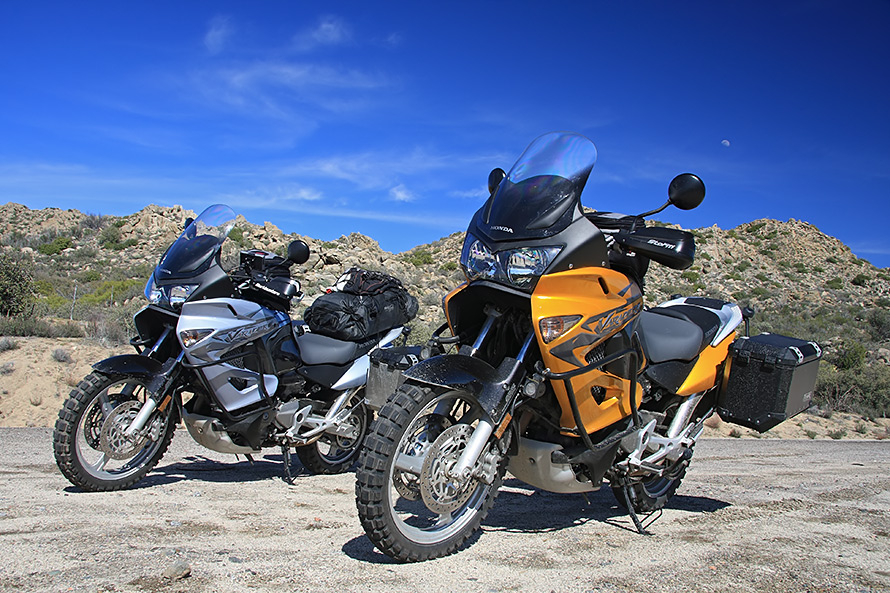 The final leg into Mike’s is technical for a bike as large as the Varadero, a rough cut road of grooves, bumps, ruts and washes that descends into one final water crossing bracketed by sand on either side from a previous flood. We pull to a stop, to contemplate our lines through the creek for all the good it does in the dark. The crossing is an act of faith in momentum, and hope that the spring run-off and recent rains haven’t left it too deep.